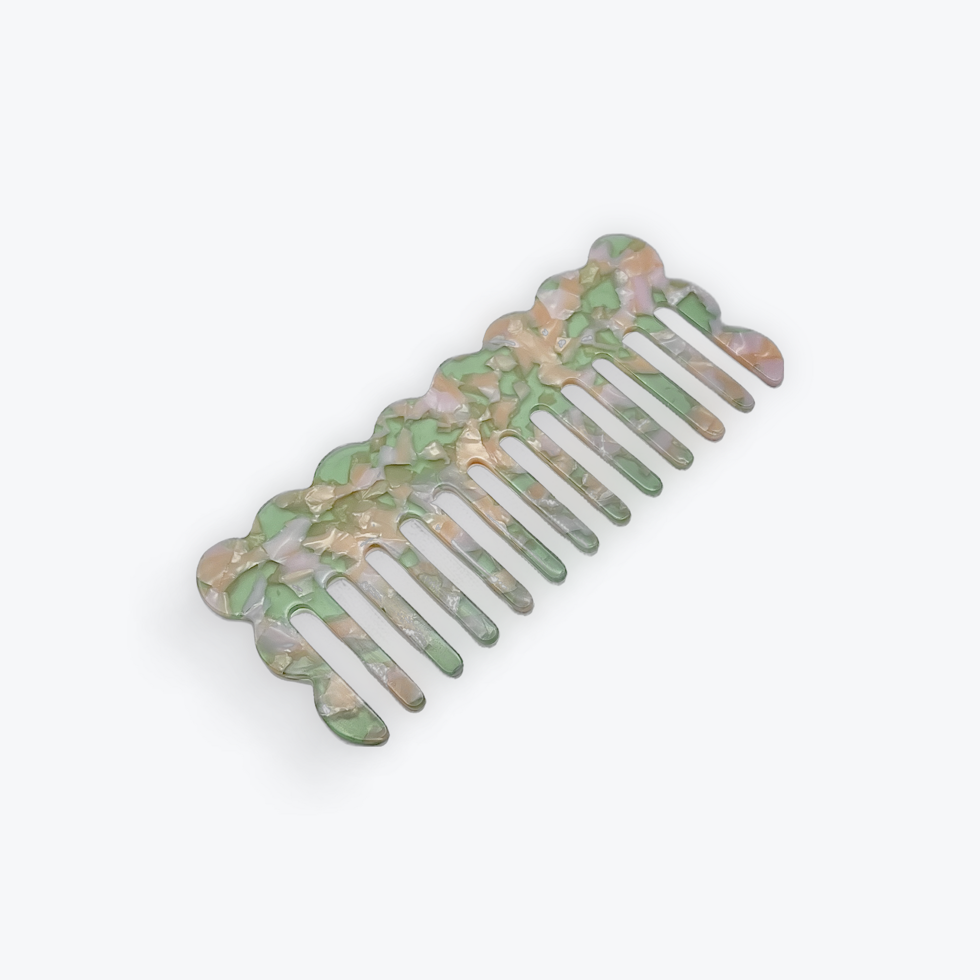 A lightweight comb in pink and green, perfect for detangling and smoothing your hair. Its compact size makes it easy to carry in your bag for quick touch-ups throughout the day!